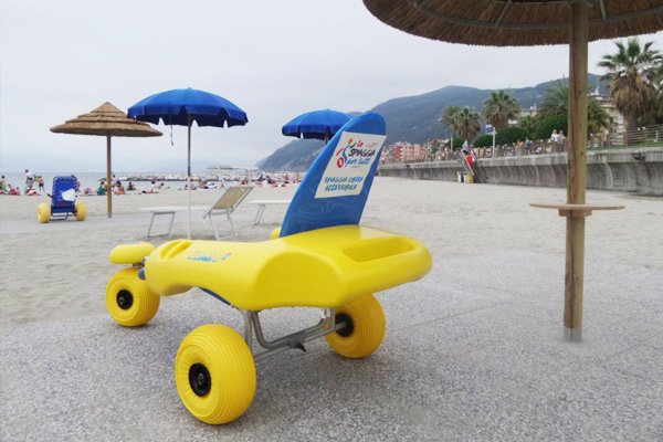 - Carrozzina tipo Job (dotata di ruote galleggianti) per attraversare la spiaggia ed entrare in acqua anche in piena autonomia.